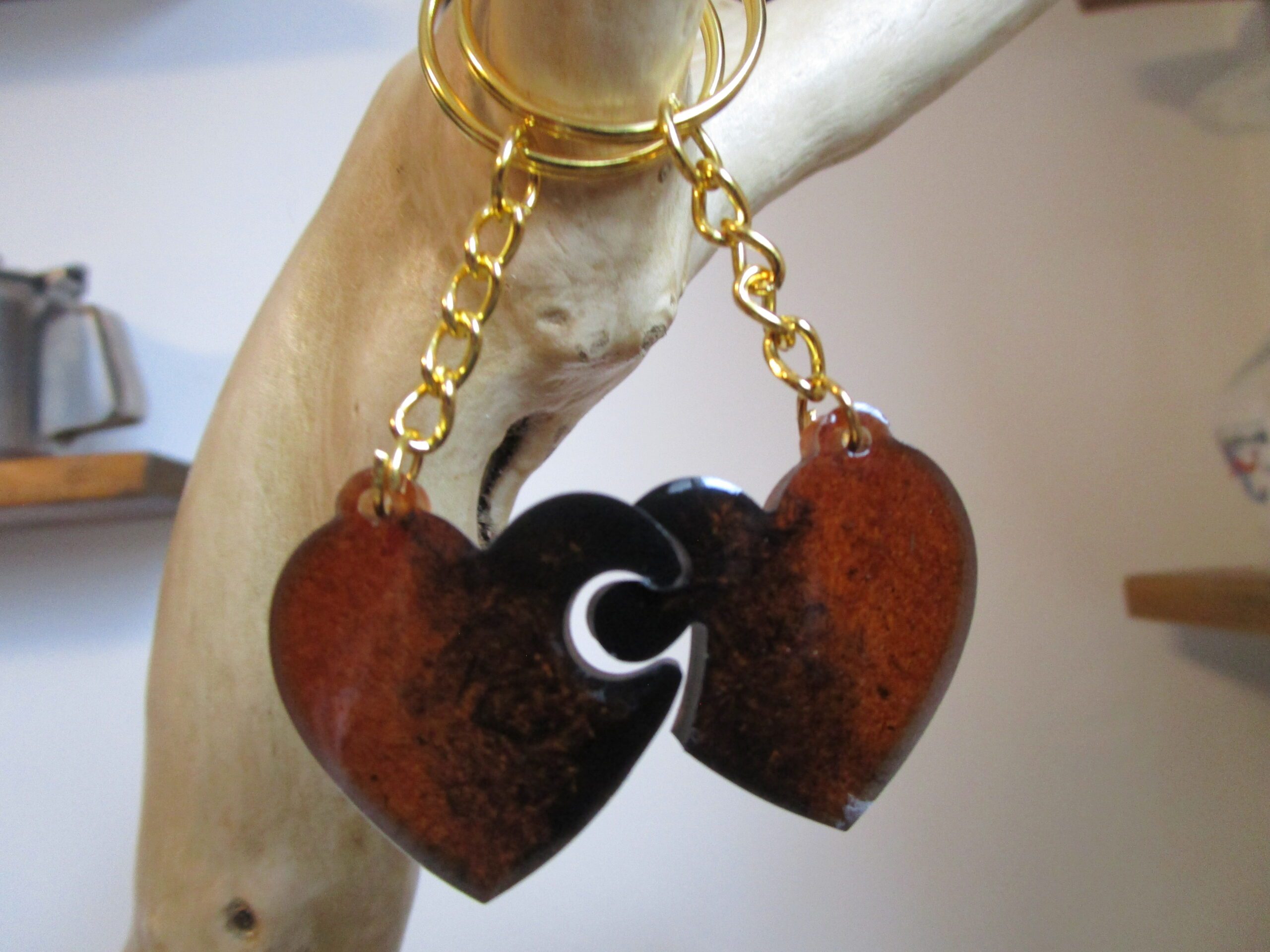 "Ce porte-clés artisanal en résine et sciure de bois est le cadeau idéal pour les couples qui cherchent un symbole unique et original de leur amour. Chaque pièce est faite à la main avec soin, ce qui en fait un cadeau vraiment spécial."
