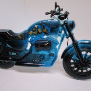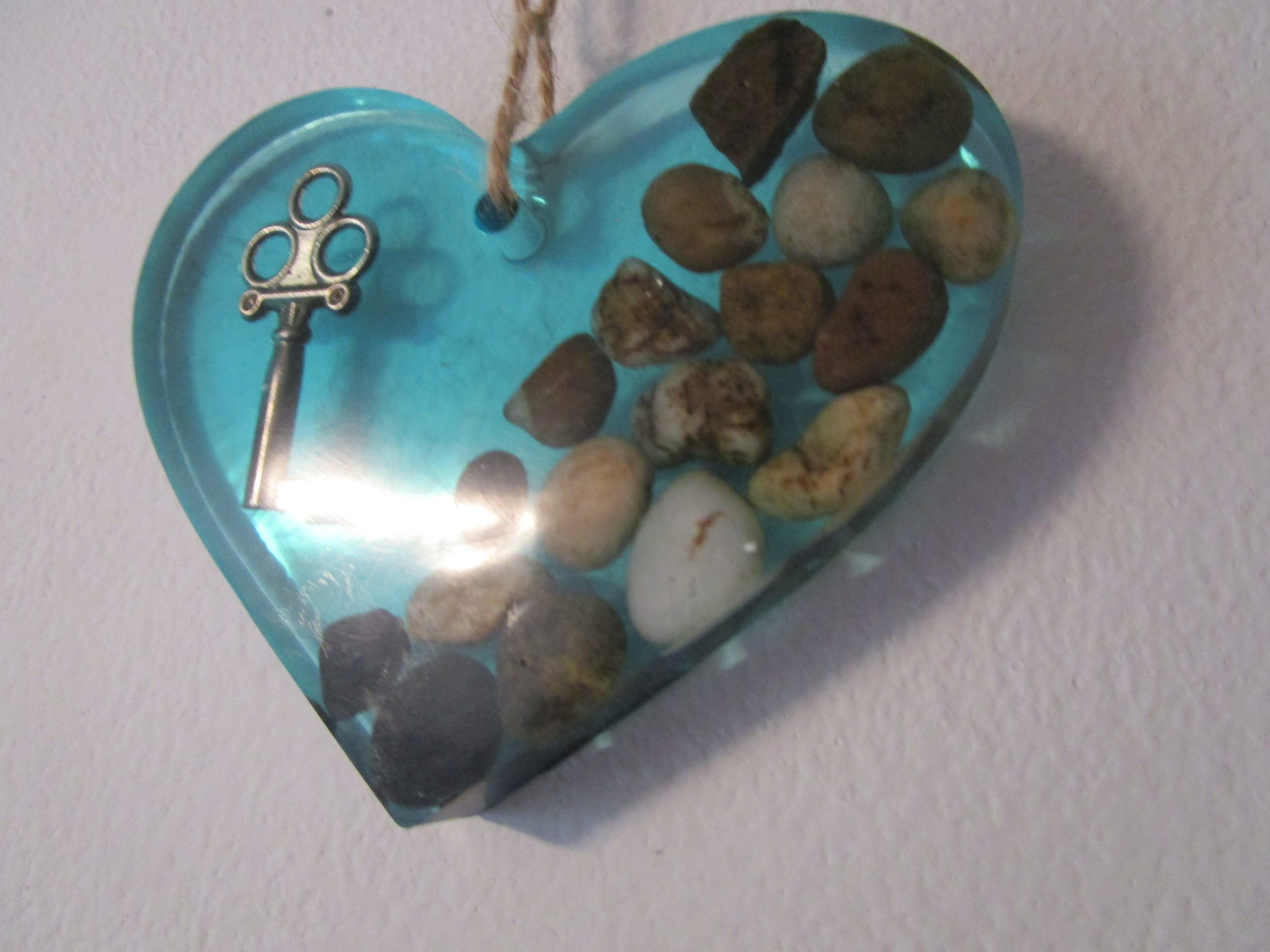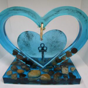 "Dans un écrin de résine bleu lagon, un cœur repose, tel un trésor venu des profondeurs marines. Des pierres naturelles, aux reflets changeants, évoquent les mystères des océans. Une clé ancienne, vestige d'un passé romantique, vient sceller ce tableau, symbole d'un amour éternel. Accrochez ce cœur à votre mur, et laissez la magie opérer..."