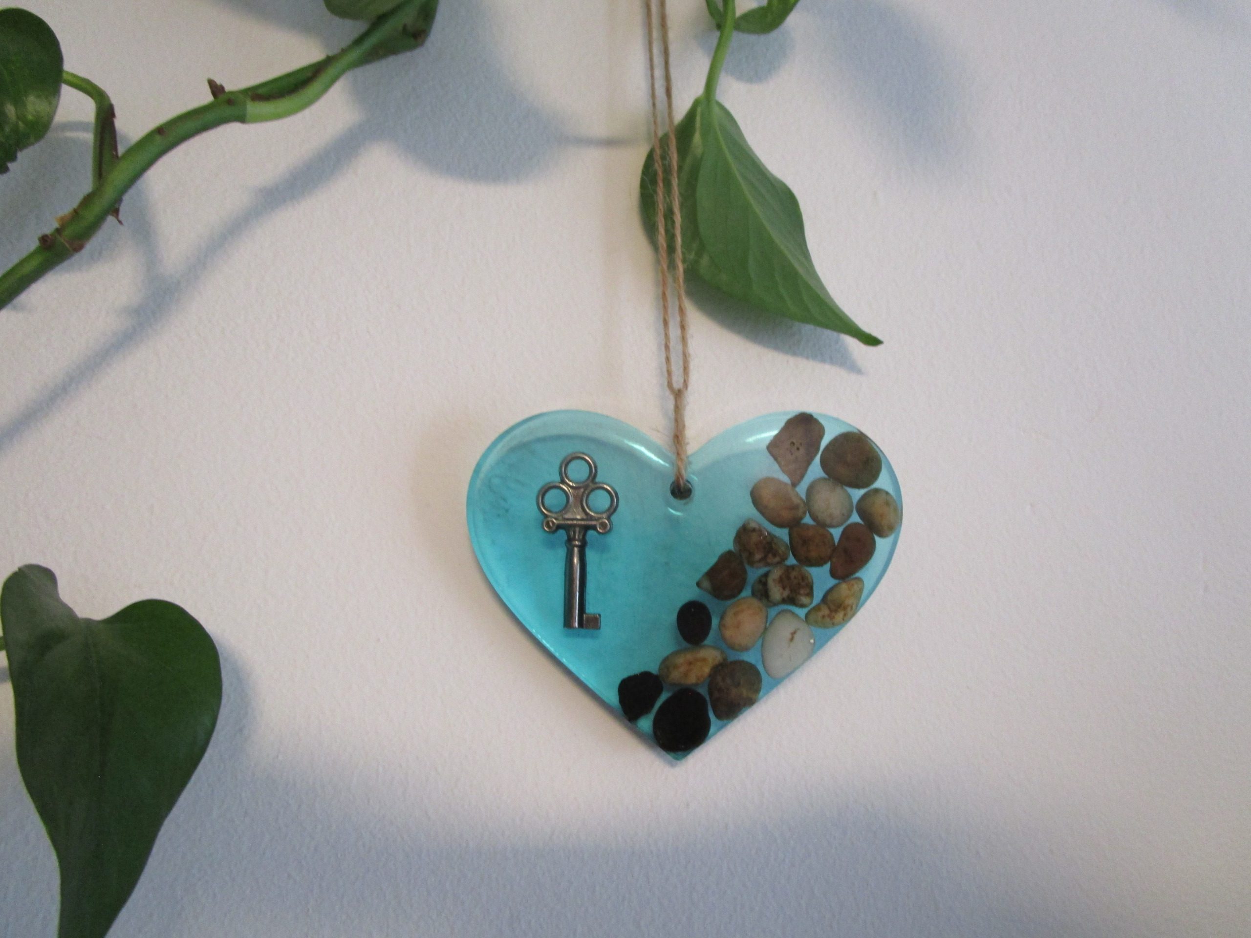« Un cœur bleu lagon, fait main avec amour, où se mêlent pierres naturelles et clé ancienne. Une pièce unique pour une décoration romantique et pleine de charme. »
