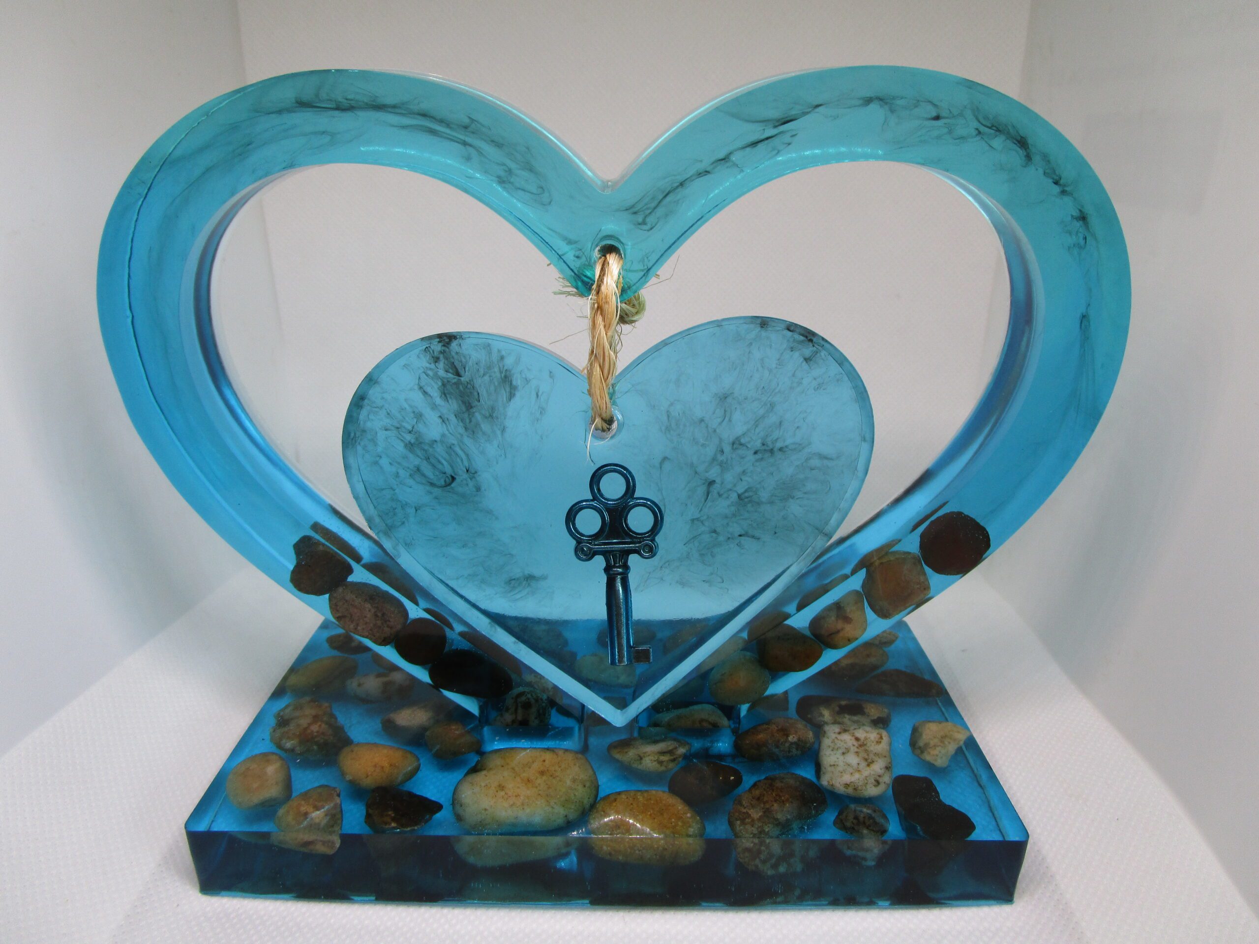 « Découvrez cette œuvre d’art artisanale, un cœur en résine translucide aux reflets turquoise, orné d’une clé ancienne et de pierres naturelles. Un objet décoratif chargé de symbolisme, parfait pour une ambiance zen et chaleureuse. »