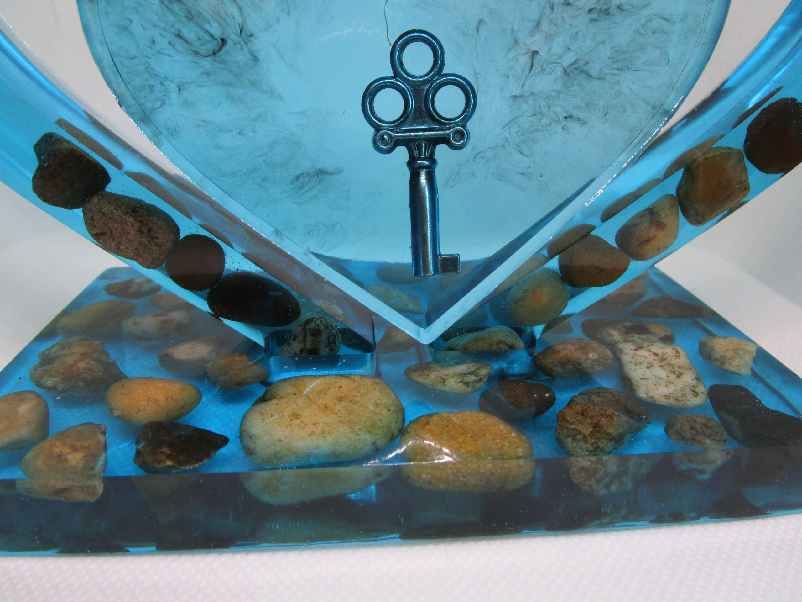 "Cette sculpture en résine, réalisée à la main, est une invitation au voyage et à la rêverie. Le cœur bleu lagon, couleur de l'eau cristalline, évoque la paix et la tranquillité. Les pierres naturelles, soigneusement sélectionnées, ajoutent une touche de caractère et d'authenticité à cette pièce unique. La clé, suspendue au cœur, symbolise l'ouverture, les nouveaux départs et les possibilités infinies."
